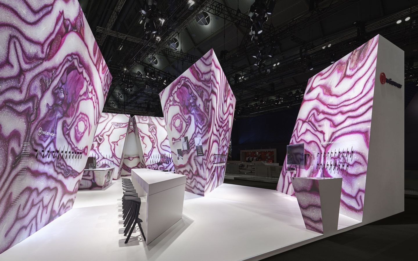 Der Messestand mit insgesamt 180 qm ist das Sinnbild für einen perfekt ausgeführten Schnitt: Vier stehende Volumen sind über schräge Schnittkanten miteinander verbunden und stellen über den ganzen Stand Bezüge zueinander her. Das Bildmotiv ergibt aus jeder Perspektive ein konsistentes Schnittbild. Die Innenseiten der Blöcke zeigen Makroaufnahmen eines frisch geschnittenen Rotkohls. Für die Aufnahmen wurde der zu fotografierende Rotkohl exakt den Formen der Volumen folgend geschnitten. Raumschnitte und Motive sind perfekt aufeinander abgestimmt und erzeugen so ein ebenso faszinierendes wie dynamisches Gesamtbild: die Inszenierung von Messer, Schärfe und Schnitt. Die Motive sind mit Hilfe von wissenschaftlichen Fotografien erstellt und stellen die Schnittkanten des Rotkohls auf den 5 m hohen Volumen bis in das kleinste Detail dar. Der Vorgang des Schneidens wird inszenatorisch überhöht und verweist auf die hohe Qualität der Produkte von WÜSTHOF.