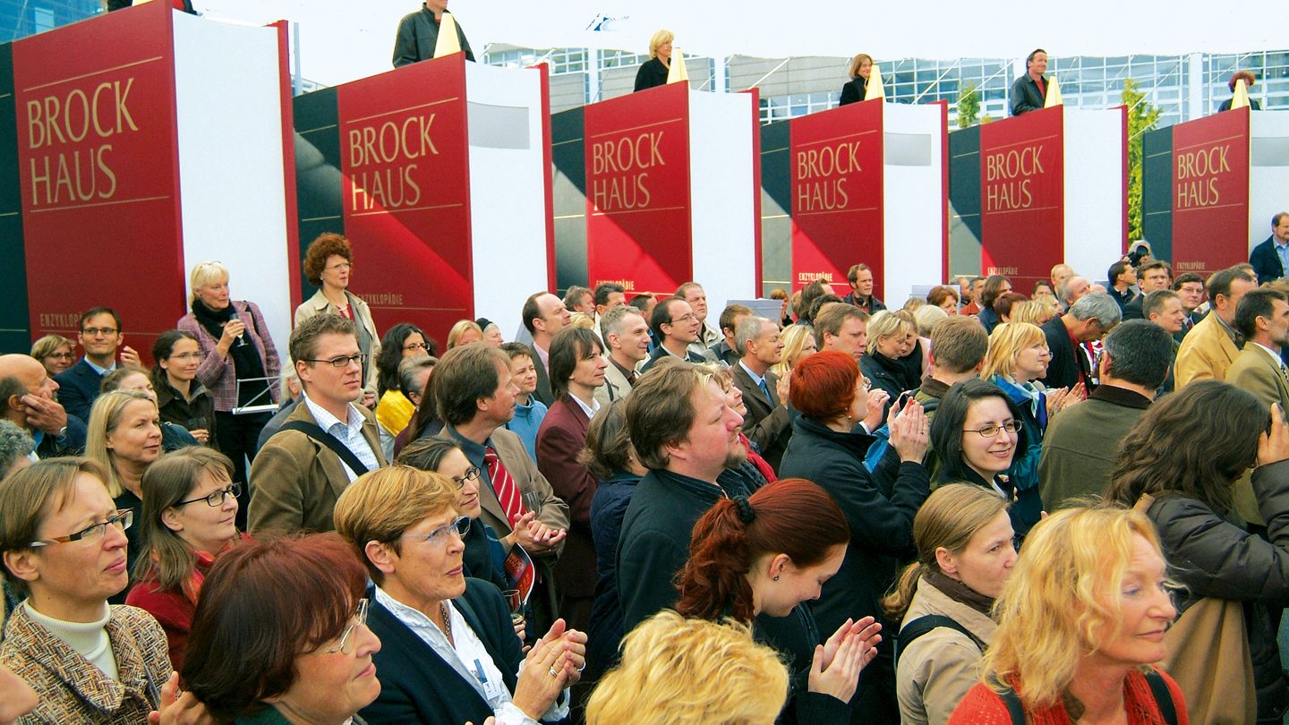 Aus Anlass des 200-jährigen Brockhaus-Jubiläums: 30 überdimensionale, kreisrund aufgestellte Bände setzten ein Zeichen für die Marke Brockhaus auf der Frankfurter Buchmesse