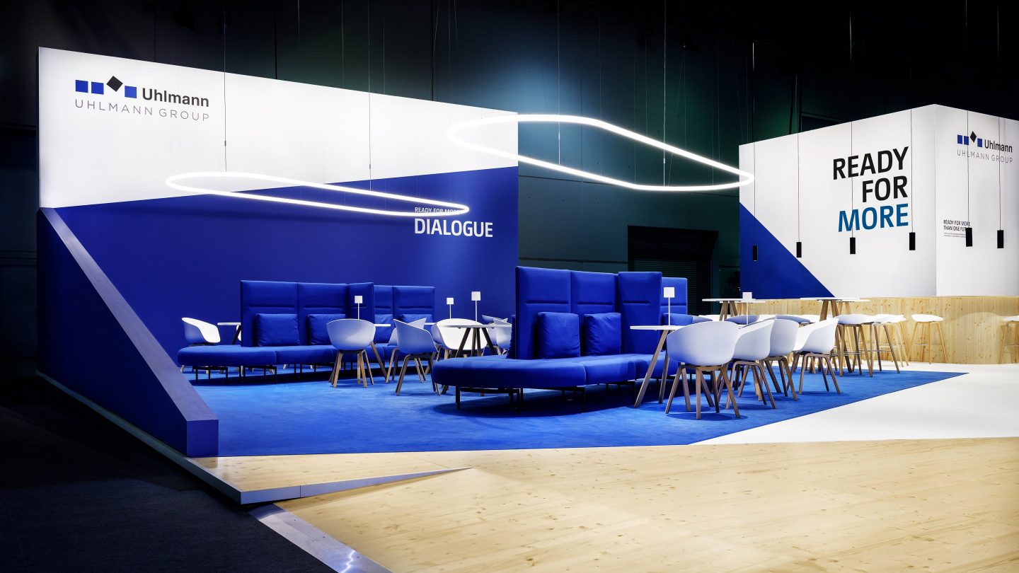 Die Besucher erleben den Messeauftritt als Dreiklang. Sie werden in einem Beratungsbereich empfangen, in dem sich die ganze Themenbreite von Uhlmann zeigt. Im Zentrum des Standes befindet sich die Innovation Area, in der die neuesten Lösungen und Produkte von Uhlmann und Cremer präsentiert werden. Die anschließenden Lounge- und Barbereiche erzeugen eine offene Atmosphäre für neue Kontakte und informellen Austausch sowie die Pflege langjähriger Geschäftsbeziehungen im konzentrierten Gespräch.